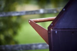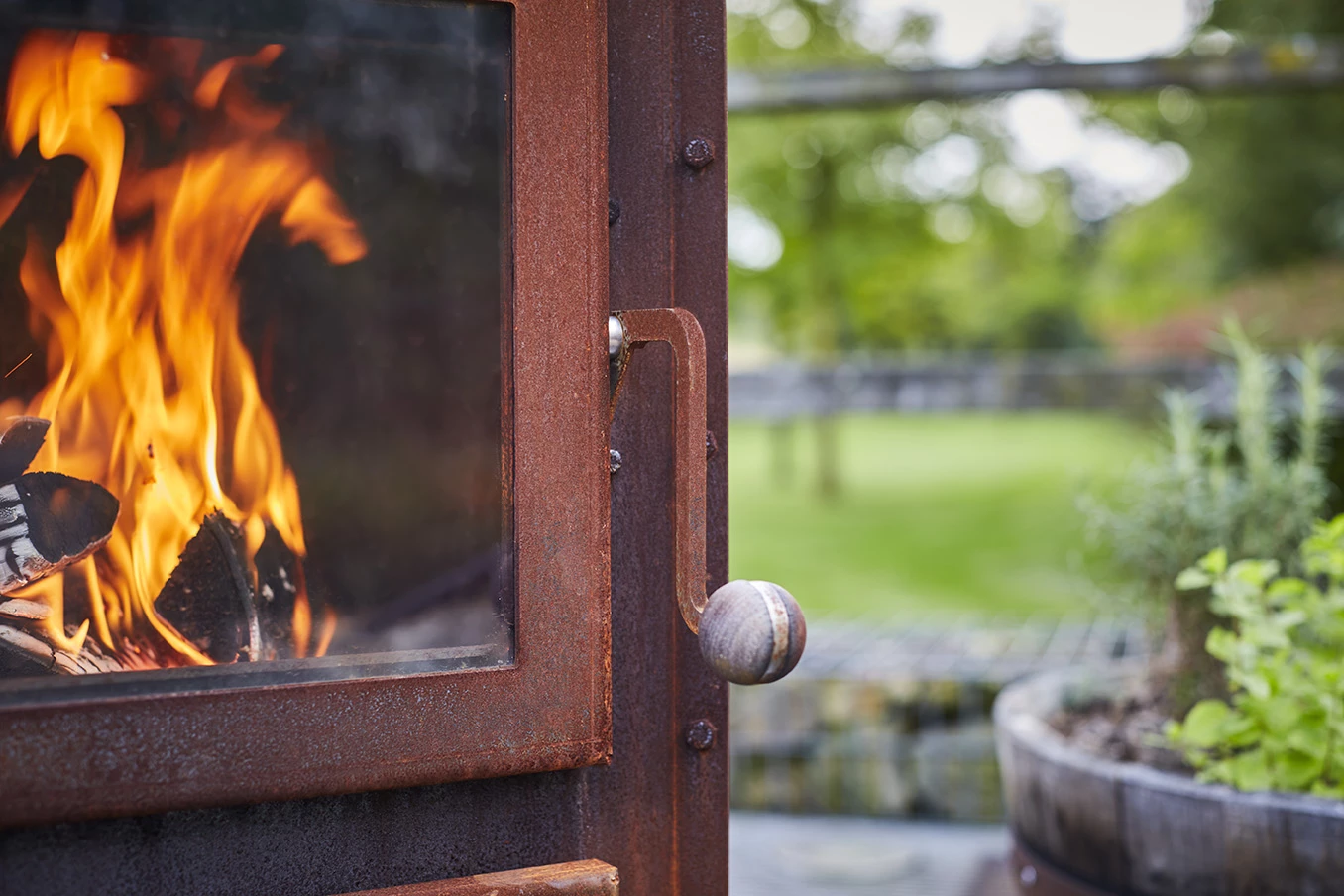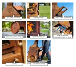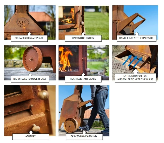 Voor de deur hendel en de duwstang werd er gebruik gemaakt van niet warm wordend merbau hardhout. De 2 grote wielen en duwstang aan de achterzijde maakt de tuinhaard eenvoudig te verplaatsen, ondanks zijn 110kg. Op de voorkant is een embleem aangebracht met verwijzing naar Reny en het ontwerpbureau die de kachel mee hielp ontwikkelen. Een unieke tuin kachel!