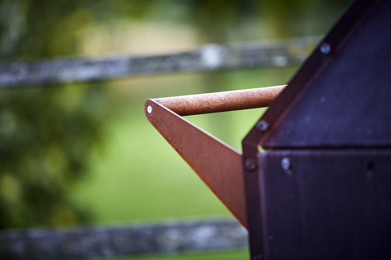 Deze design Bijuga buitenhaard met wielen is een robuuste Cortenstaal houtkachel voor in de tuin op terras of aan het poolhouse. Het tijdloze design combineert strakke lijnen en vlakken met industriële accenten. Het staal plaat materiaal werd naar buiten geplooid waardoor de verbindingsnaden en alle bouten en moeren duidelijk zichtbaar zijn.