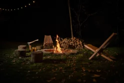 Eenvoudige en tegelijk vernuftige Fieldchair houten klapstoel in larikshout. met de lederen riem eenvoudig op te bergen en mee te nemen. Klap hem uit en geniet in de tuin bij de vuurschaal of van de warmte van de tuinhaard.