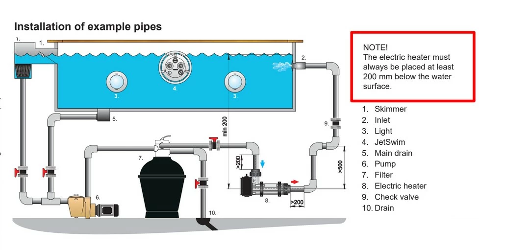 Het is aan te raden om een flow switch te monteren voor de wisselaar. Hebt u zwembadwater met ZOUT of een ZOUTELECTROLYSE gebruik dan de warmtewisselaar met het TITANIUM verwarmingselement.