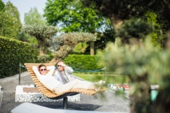 De Lazy Daisy lounger heeft een stevige metalen voet, kan ronddraaien en is perfect gemaakt om te laten buiten staan. Optioneel kan je links en rechts een beweegbaar klein tafeltje mee bestellen, ideaal om een drankje of boek op te leggen.