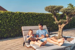 De matras van de Lazy Daisy is gemaakt van Sunbrella stof. Sunbrella is een synthetische acrylvezel en is speciaal ontwikkeld voor buitengebruik, zoals de stof van de zeilen van een zeilboot of het dak van een cabrio. De aangename en comfortabele stof is niet enkel weerbestendig, maar kan ook tegen heel wat andere stootjes. Kinderen die ravotten in uw nieuwe loungezetel? Geen probleem! Per ongeluk een glas rode wijn gemorst op het kussen? Geen probleem!