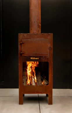 De oven voor in de tuin is gemaakt van 3mm dik Cortenstaal. Dit materiaal roest op natuurlijke wijze en vormt zo een soort beschermlaag die “doorroesten” voorkomt. De kleur is roestbruin en kan donkerder worden na verloop van tijd.