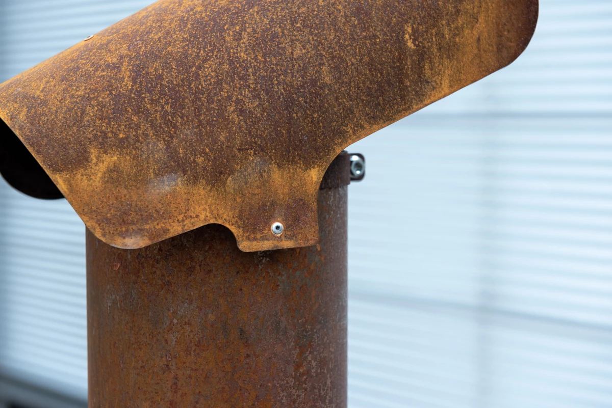 Deze kap voor op de schoorsteen van de Outdooroven doet dienst als regenkap en werkt ook als vonk vanger. Gemaakt van cortenstaal.