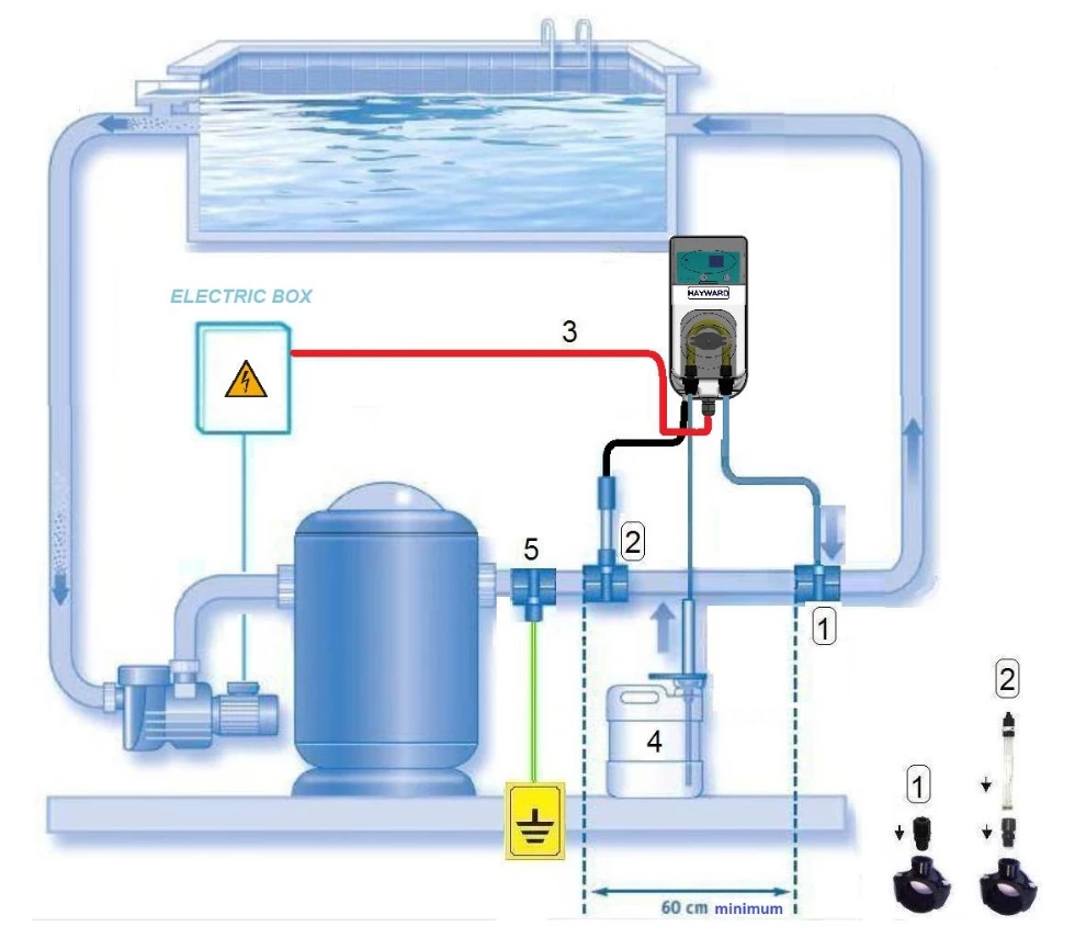 We adviseren om de dosering van het zuur (ph Min) NA de zandfilter en NA de verwarming (warmtepomp of warmtewisselaar) te installeren. Dit omwille van het feit dat ph min (zuur) het vuil op de zandfilter kan losmaken, waarna het in het zwembad terecht komt. Dit zal troebel water veroorzaken. Ook de warmte bron kan aangetast worden als u het zuur doseert voor de verwarming. ALGEMENE REGEL dus dosering zo dicht mogelijk bij het zwembad, na de technische installatie van het zwembad. Gebruik bij voorkeur zwavelzuur en geen zoutzuur. Zoutzuur geeft dampen af die alle metaal onderdelen in de technische ruimte aantast.