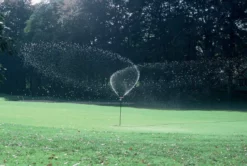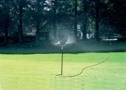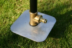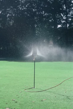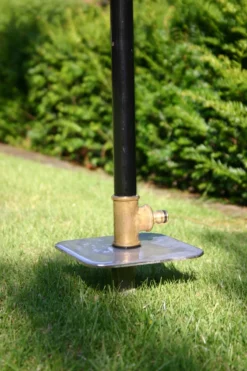 De grond pin heeft een stalen plaat waardoor je ze makkelijk in het gras kan vastzetten. Kan via een standaard tuinslang koppeling aangesloten worden.