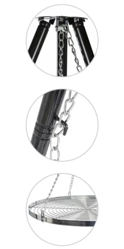 De poten zijn gepoedercoat en stevig. De poten van deze Tripod grill staan ook ver uit elkaar voor betere stabiliteit. Dit BBQ statief is zeer eenvoudig te installeren. De poten bestaan uit drie delen die in elkaar draaien. Het opbergen is eenvoudig gezien de weinige plaatst die het in beslag neem. Met deze driepekkel maak je van uw vuurschaal heel eenvoudig en snel een hout BBQ.