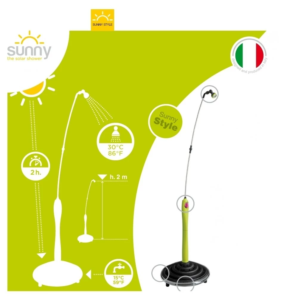 Met onze Sunny Solar Douche kan u enkel en alleen door de opwarming met de zon een warme douche nemen. Zeer handig te verplaatsen en eenvoudig aan te sluiten aan de tuinslang. Het water kan u met een mengkraan regelen naar een temperatuur van 30°C