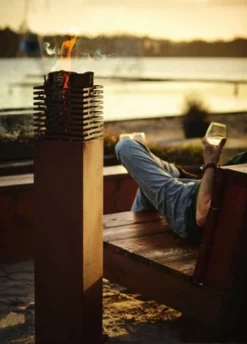 Deze stalen zuil krijgt een natuurlijke look door het roesten doorheen de tijd. Bijkomend kan deze gebruikt worden om vuur in te maken met enkele blokken berkenhout. Daarnaast wordt de design vuur toorts gebruikt als houder voor Finse – of Zweedse fakkels. Dit zijn houtblokken die van binnenuit in brand gestoken worden.