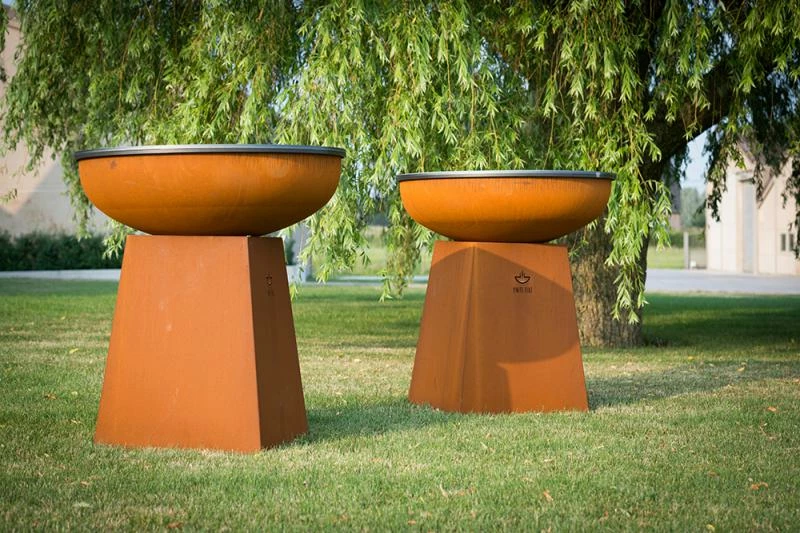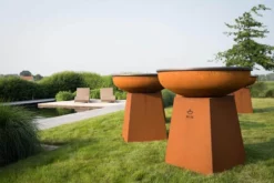 De barbecue is rondvormig en staat op een voetstuk. Je kan de barbecue schaal vullen met houtskool of houtblokken waardoor je het kan gebruiken als vuurschaal, maar het bijzondere aan deze schaal is de brede rand die je kan gebruiken als grillplaat om lekker op te koken.